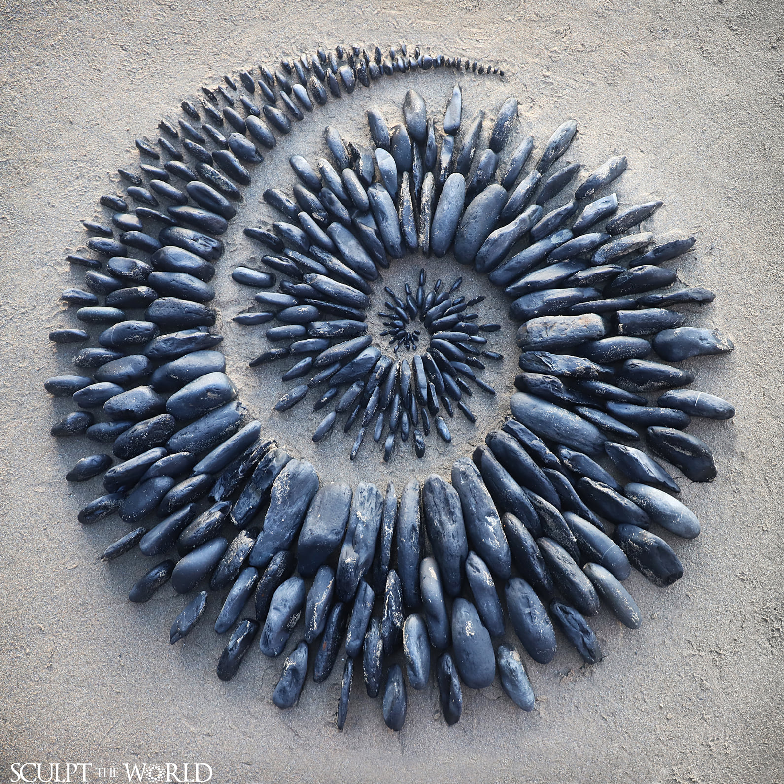 Jon Foreman: Created at Freshwater West. A couple of years back I created a very similar piece to this, the only difference being that the stones were previously placed flat. I feel the sense of movement is enhanced with them placed this way really radiating outward as they disperse.